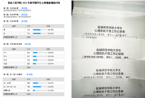 根据我院学生心理健康现状与专业特点,精心设计问卷,于9月9日至9月11日期间开展新学期心理状态全员筛查,共收回问卷调查1465份。学院对测评结果展开科学分析与合理利用,针对性开展谈心谈话工作,及早分类疏导学生心理压力,制定个性化心理健康教育方案,建立“一生一策”学生心理成长档案。