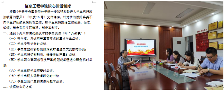 学院制定《信息工程学院谈心谈话制度》,构建“学院-学生会-班级-宿舍-家庭”的五级心理预警网格,依托学生会心理健康部、学生党团骨干、班级心理委员、宿舍长、学生家长等群体,强化家校联动机制,重点关注学生是否遭遇重大变故、重大挫折及出现明显异常等情况。辅导员、班主任进宿,学院召开学生心理异常情况研判会,对出现高危倾向苗头的学生及时给予干预帮扶,实现心理预警全覆盖。