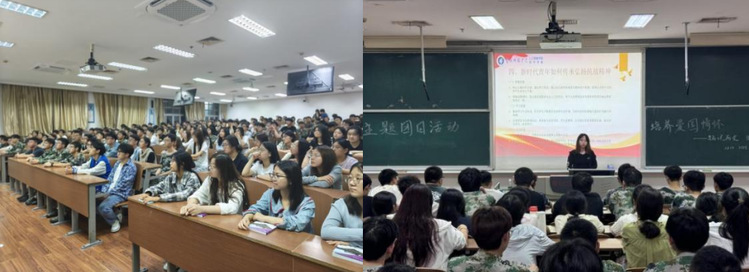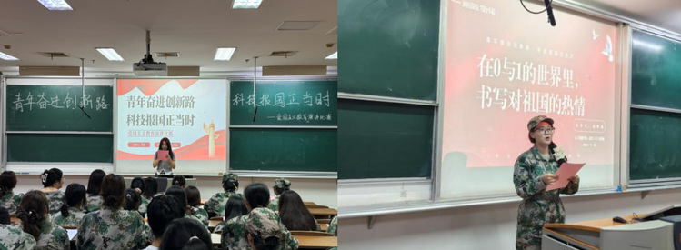 理论筑基:思政课堂点燃信仰之光。9月18日,大国担当主题思政课率先开讲。课程通过丰富的历史资料和珍贵的影像,结合专家的深入讲解,回顾了中国人民为世界反法西斯战争胜利作出的巨大贡献与牺牲,清晰阐述了中国在战争进程中的关键作用。课后,全体新生齐唱《歌唱祖国》,在激昂的旋律中深化对祖国的情感认同。学院同步开展青春告白祖国观后感征文活动,收到优质稿件300篇,有效促进了理论学习向思想内化的转化。